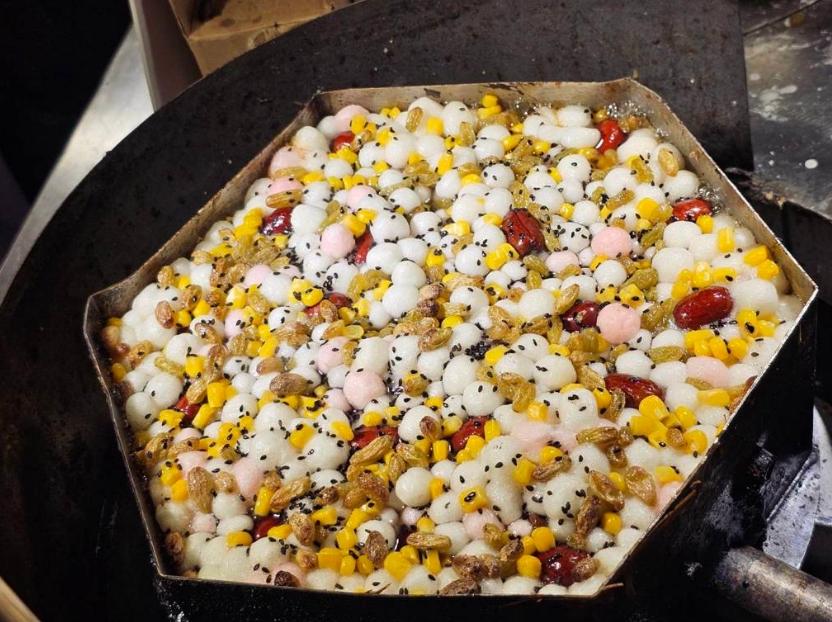 报道称,梅花糕的制作流程大约闷煎15分钟,直到表面焦黄、汤圆软糯就可起锅。摊主连老板表示,“以南京传统来说,下层酥皮及上头的小汤圆是主要成分,各家有各家特色,而我的特色是加了些八宝粥的料”。
