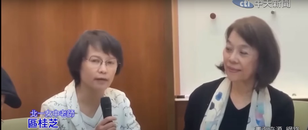 视频中慷慨激昂的发言者是台北第一女子高中语文老师区桂芝。在日前一场“去中国化的历史教育”记者会上,区桂芝发表了一篇2000多字声明稿。她表示,回首台湾过去20多年的教改,始终在“去中国化”的幽灵原则指导下进行,让各级学校、老师、学生沉入愈来愈黑暗的教育深渊。