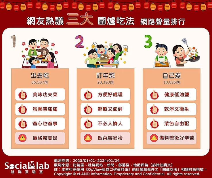 中新网2月5日电 据台湾《联合报》报道,台湾有网站通过“OpView社群口碑数据库”追踪近一年“围炉吃法”(年夜饭吃法)话题的网络声量表现。