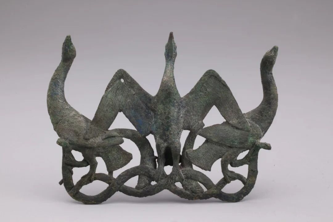扣饰主体造型为三只依偎在一起的水鸟,三只水鸟的足下踩踏着两条蛇,蛇首昂立,蛇身交错,呈左右对称排列。该扣饰展示了高超的工艺水平,反映了滇人对自然界的观察和艺术表达。