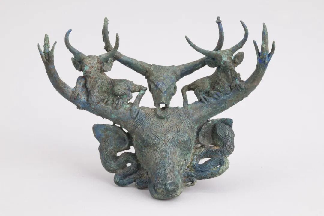 铜饰的主体是一个大牛头,牛的面部装饰有线刻的花纹,脸颊两侧各铸有一条蛇。蛇嘴咬牛耳,身蜿蜒曲折,富有动感,与大牛两角上闲适静卧的小牛形象形成鲜明的对比。