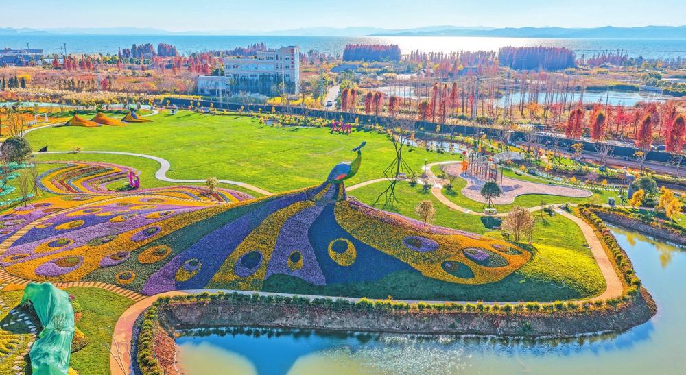 位于滇池东岸的巨型孔雀花坛。记者 陈飞 摄