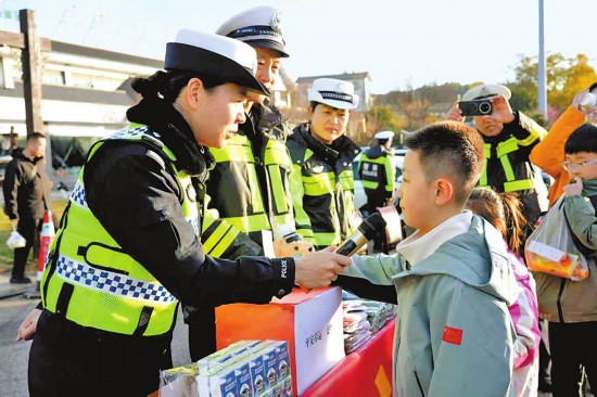 宣传民辅警提前在服务区搭好展台,摆放主题展板、事故案例视频和印有安全标语的文创品。展板上“酒驾醉驾危害大”“超员超载=危险加倍”等标语格外醒目。