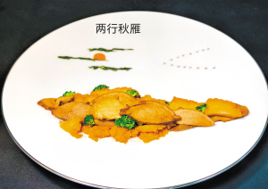 石康林介绍,“北走蜿蜒”以黄瓜、诺邓火腿、豆干、树花为原料,精准摆盘还原长虫山蜿蜒如龙的走势,尽显长联中 “北走蜿蜒”的磅礴意境;“半江渔火”取滇池渔民劳作与湖景风貌之灵感,选用宜良小刀鸭置于小船状脆壳中,淋上黑松露酱后,金黄酥脆的外皮宛如夜晚捕鱼时的点点灯火,既还原了长联中“渔舟唱晚”的画面,又兼顾口感。