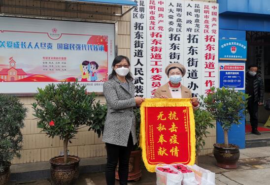 拓东街道办事处负责人向董美珍(右)赠送锦旗以示感谢