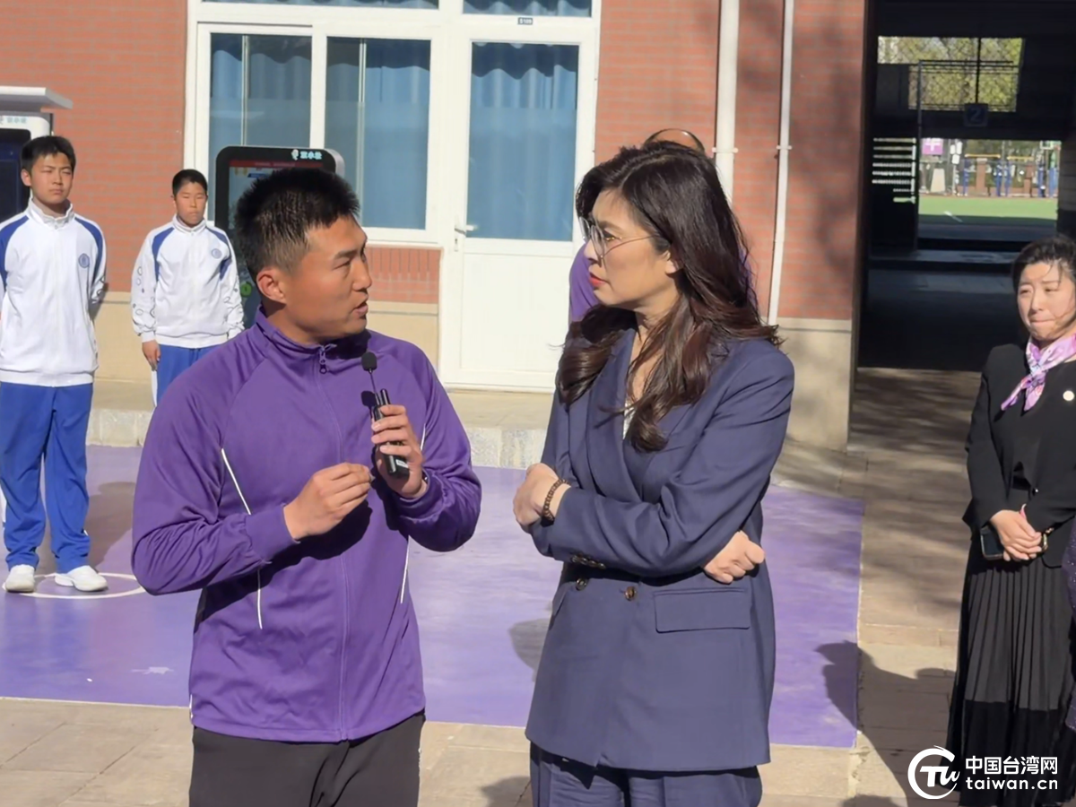 4月10日下午,中国国民党主席郑丽文率国民党参访团到访清华大学附属中学。参访过程中,郑丽文与体育老师交流互动。(中国台湾网发)