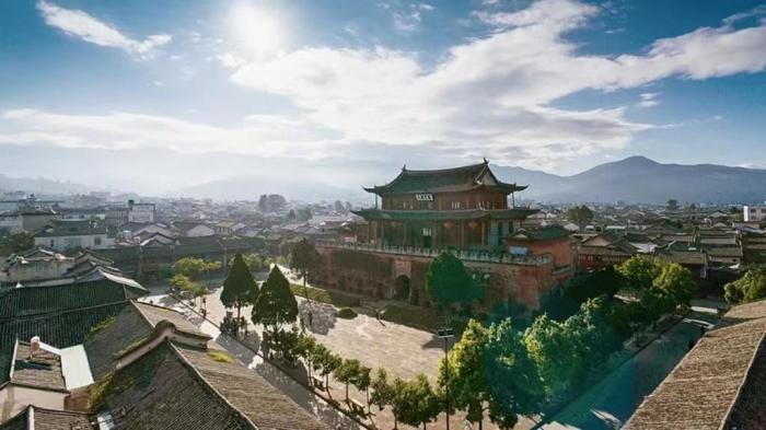 巍然屹立的拱辰楼和星拱楼,成为古城的标志性建筑。古城形方如印,城中心为星拱楼。北城楼名拱辰楼,城楼南北分别挂有“魁雄六诏”“万里瞻天”横匾,气势雄伟。登上楼顶俯瞰,城中街道向四方延伸,屋舍俨然。(完)