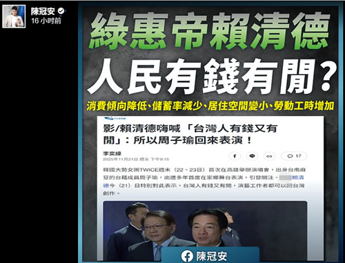 中国国民党青年部前主任陈冠安评论称,赖清德真是“绿惠帝”,根本是“何不食肉糜”翻版。他列举数据表示,台湾民众储蓄率已连续4年减少,2021年到2024年从25.23%下滑到23.73%。消费倾向从78.73%下降到76.27%,2024年的平均住宅坪数也创下2000年以来新低纪录。民众越来越穷,但有闲了吗?他说,赖清德同样错得离谱。根据台劳动部门数据,2024年每人每月平均工时达169.2小时,创6年新高,而每人每月加班工时8.5小时,更是10年最高,“人民有钱吗?”